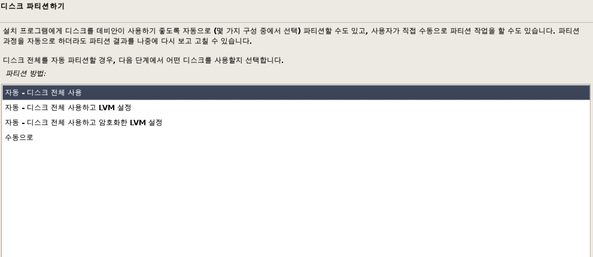 root 비밀번호 설정과 네트워크까지 지나고 나면 파티션에 대한 설정이 나옵니다.