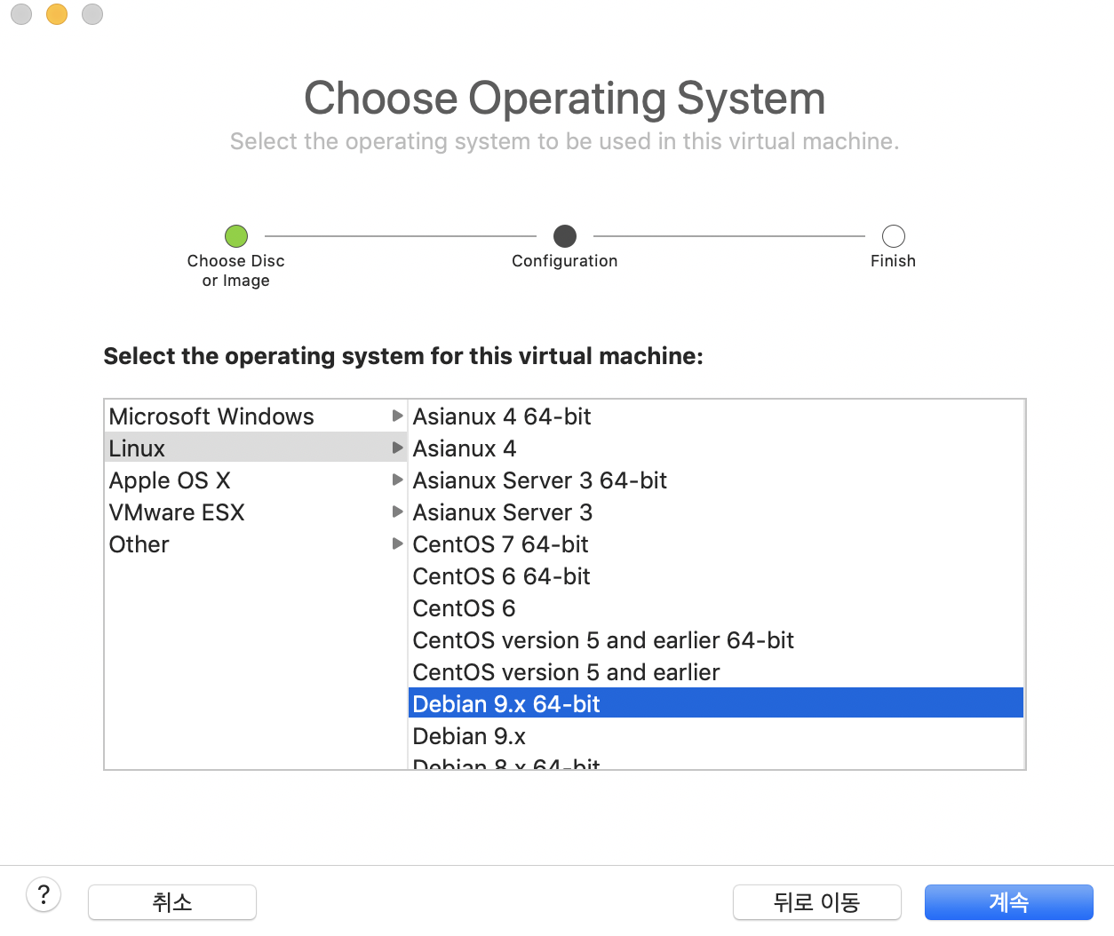칼리 리눅스는 데비안 기반으로 debian 9.x 64-bit를 설정해줍니다.