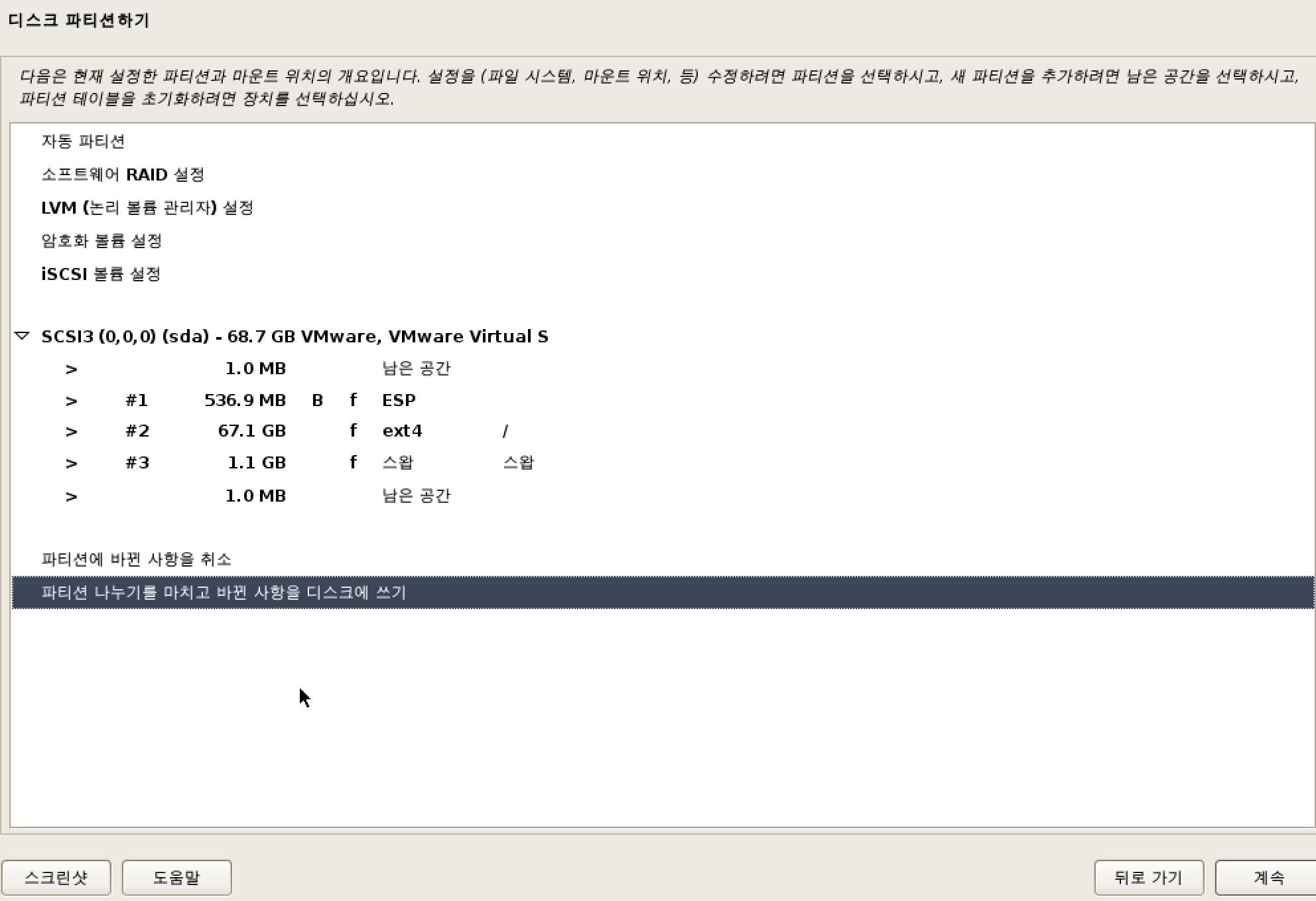 권장으로 선택되어 있는 파티션 나누기를 마치고 바뀐 사항을 디스크에 쓰기 선택후 계속 클릭합니다.