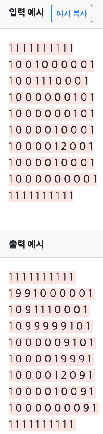 10x10의 배열이 주어지고 마치 태두리를 입은것 마냥 마지막은 1로 채워져 있다.